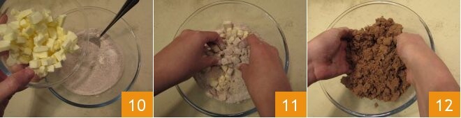 Adicione também a manteiga na tigela 10, trabalhe a massa rapidamente com a ponta dos dedos 11 até obter uma farofa 12.