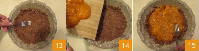Unte uma forma de 26 cm de diâmetro e polvilhe o fundo e as bordas com açúcar mascavo. Despeje metade da massa e nivele no fundo com um garfo 13. Agora despeje os caquis 14 e distribua com o garfo ou uma colher para criar uma camada de recheio uniforme 15.
