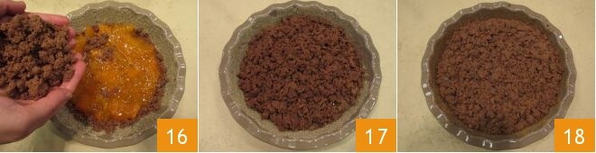 Agora despeje a outra metade da massa 16 de modo a cobrir completamente o recheio 17. Asse a sobremesa em forno estático pré-aquecido a 180° por 40 minutos. Ao final do cozimento, retire o bolo de caqui do forno, deixe esfriar um pouco antes de servir polvilhando a superfície com cacau cru 18.