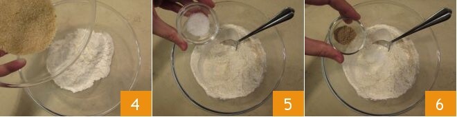 Agora cuide da massa: despeje a farinha peneirada em uma tigela grande, adicione o açúcar mascavo 4, o flor de sal 5 e o cardamomo em pó 6.