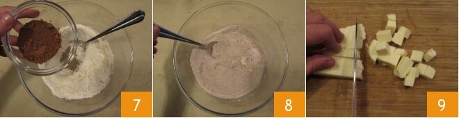Adicione também o cacau cru 7 e misture para integrar os pós 8. Corte a manteiga fria em cubos 9.