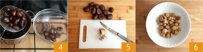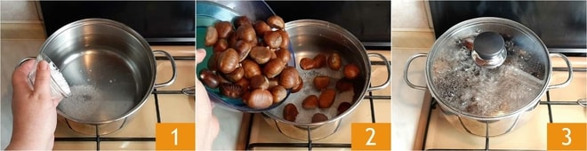 Para preparar a torta de castanhas, primeiro encha uma panela com água, adicione um pouco de sal grosso 1 e coloque as castanhas 2. Quando começar a ferver, cubra com uma tampa 3 e cozinhe por cerca de 30-40 minutos (dependendo do tamanho das castanhas).