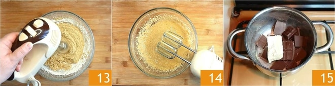 Bata com uma batedeira elétrica 13 até obter uma massa cremosa 14. Raspe bem toda a massa com uma espátula, inclusive das bordas da tigela. Agora cuide do chocolate: quebre-o e coloque-o em uma panela junto com a manteiga 15.
