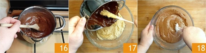 Derreta tudo em fogo bem baixo, mexendo com uma colher de pau 16, como alternativa, você pode usar o micro-ondas para fazer esta operação. Deixe o chocolate esfriar um pouco, depois adicione à massa 17 e misture com uma espátula 18.