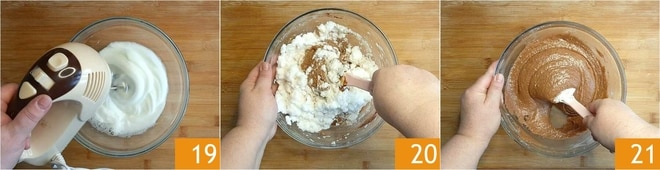 Bata as claras em neve bem firme 19, depois adicione à massa, incorporando delicadamente e fazendo movimentos de baixo para cima 20. Quando obtiver uma mistura homogênea 21,