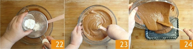 adicione o fermento em pó peneirado 22 e misture novamente delicadamente para incorporá-lo 23. Unte uma forma retangular de 22x15 cm e despeje a massa dentro dela 24.