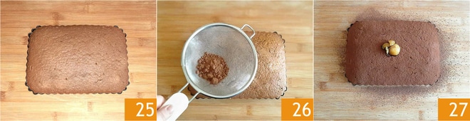 Asse em forno estático pré-aquecido a 180°C na prateleira inferior por cerca de 30 minutos. Verifique sempre o cozimento fazendo o teste do palito. Tire o doce do forno 25 e deixe esfriar. Polvilhe com cacau em pó 26, decore com as castanhas reservadas anteriormente, pincelando-as com um pouco de mel e sirva sua torta de castanhas 27.