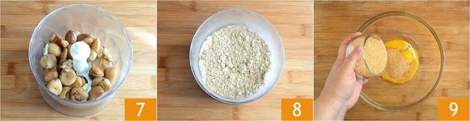 Deixe esfriar. Reserve algumas para a decoração e coloque as demais em um processador 7. Bata até obter uma espécie de farinha granulada 8, depois reserve. Separe as gemas das claras em duas tigelas. Na tigela das gemas, adicione o açúcar mascavo 9,