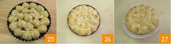 Depois de preencher toda a forma 22, pincele o bolo com o suco da maceração das cerejas 23 e decore com as lascas de amêndoas 24.