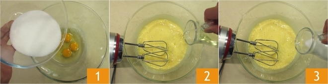 Para preparar o bolo de chocolate, peras e nozes, coloque os ovos e o açúcar em uma tigela grande 1 e comece a bater com uma batedeira elétrica na velocidade máxima até obter uma mistura fofa e espumosa. Adicione o óleo vegetal 2 e o leite 3.