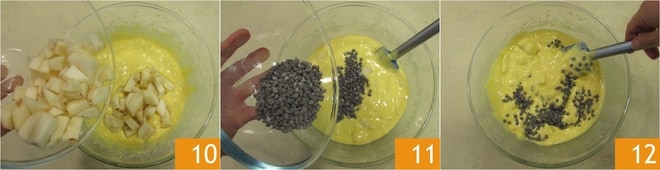 Adicione as peras descascadas à massa 10 e misture com uma espátula, depois adicione também as gotas de chocolate 11 e misture bem tudo 12.
