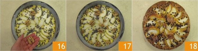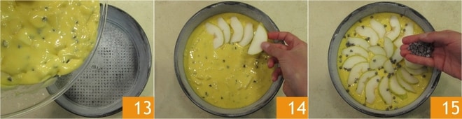 Despeje a massa obtida em uma forma de 22 cm de diâmetro, untada e enfarinhada 13. Nivele a superfície e organize em círculo as fatias de pera com casca 14, em seguida polvilhe com as gotas de chocolate 15.