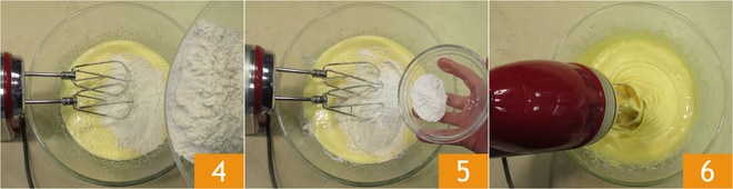 Adicione também a farinha 4 e o fermento 5, previamente peneirados. Trabalhe com a batedeira em velocidade alta para incorporar os ingredientes 6.