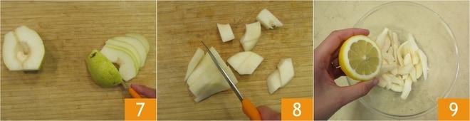 Neste ponto, descasque uma das peras e mantenha a outra com a casca: divida ambas ao meio e retire o miolo, em seguida corte aquela com a casca em fatias 7 e a sem casca em pedaços 8. No total, você precisará de cerca de 400 g de peras. Regue com suco de limão para evitar que escureçam 9.