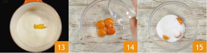 Enquanto isso, prepare o creme de limão: despeje o leite em uma panela, adicione as raspas de limão e a baunilha e leve quase à fervura 13. Enquanto isso, coloque as gemas em uma tigela separada 14 e adicione o açúcar 15.