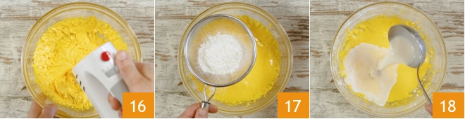Bata as gemas com uma batedeira até obter uma mistura clara e espumosa 16, depois peneire o amido de milho na tigela 17 e continue a trabalhar para incorporá-lo de forma uniforme. Remova as raspas de limão da panela, depois adicione uma concha de leite quente à mistura de gemas 18, mexendo bem para diluí-la.