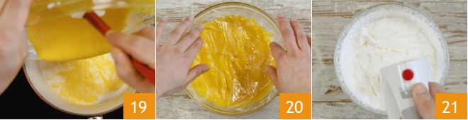 Despeje a mistura obtida na panela junto com o restante do leite 19 e mexa continuamente em fogo baixo até que atinja a consistência desejada. Quando o creme estiver espesso, transfira-o para uma tigela e cubra com filme plástico em contato 20. Enquanto isso, bata o chantilly que você usará para a decoração 21.