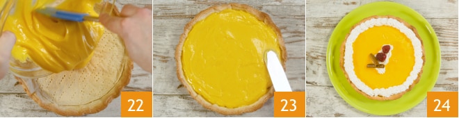 Neste ponto, a base estará cozida, então retire do forno e deixe esfriar. Quando ambas as preparações estiverem em temperatura ambiente, despeje o creme na casca de massa 22 e nivele a superfície com uma espátula 23. Decore com o chantilly, biscoitinhos crocantes (se desejar) e framboesas ou outras frutas a gosto: sua torta de claras com creme de limão está pronta para ser apreciada 24!