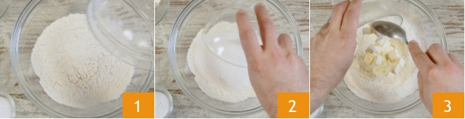 Para preparar a torta de claras com creme de limão, primeiro prepare a massa: coloque a farinha 1 e o açúcar em uma tigela grande 2, faça um buraco no centro e adicione a manteiga fria em cubos 3.