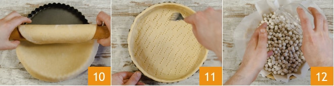 Enrole a massa ao redor do rolo e desenrole-a delicadamente sobre uma forma de 18 cm de diâmetro (não é necessário untar) 10, depois pressione com os dedos para fazê-la aderir também nas bordas. Fure a base com os dentes de um garfo, cubra com uma folha de papel manteiga e encha a forma com legumes secos ou esferas de cerâmica 12. Prossiga com o cozimento às cegas, colocando a base no forno por 15 minutos em forno estático pré-aquecido a 180°, depois remova os pesos e o papel manteiga e asse por mais 15 minutos sempre à mesma temperatura.