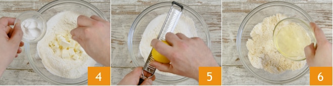 Adicione também o bicarbonato 4 e as raspas de limão raladas 5. Comece a trabalhar com os dedos até obter uma mistura quebradiça, depois adicione as claras em temperatura ambiente 6.