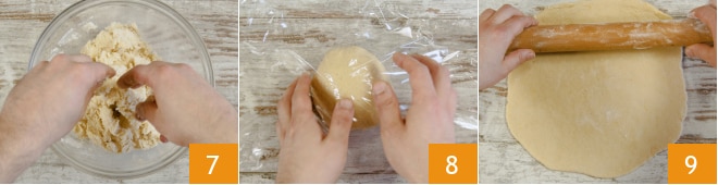Continue amassando para incorporar todos os ingredientes 7, em seguida transfira a mistura para uma superfície de trabalho e forme um bloco liso e homogêneo. Envolva a massa em filme plástico 8 e deixe descansar na geladeira por cerca de 30 minutos. Após o tempo de descanso, estenda a massa sobre uma superfície de trabalho levemente enfarinhada até uma espessura de 4-5 mm 9.