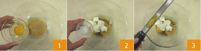 Para preparar a torta com creme e ameixas, comece pela massa: em uma tigela coloque o açúcar mascavo, o ovo médio 1, a manteiga, o sal 2 e a casca de limão 3.