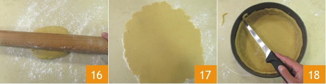 Estenda o bloco de massa em uma bancada enfarinhada 16, você deve obter uma espessura de cerca de 5 mm 17. Coloque delicadamente a massa estendida na forma de 22 cm de diâmetro e cubra a base e a borda pressionando levemente com os dedos (não importa se no momento não está perfeita ou simétrica). Corte o excesso formando uma borda de cerca de 3 cm de altura 18.