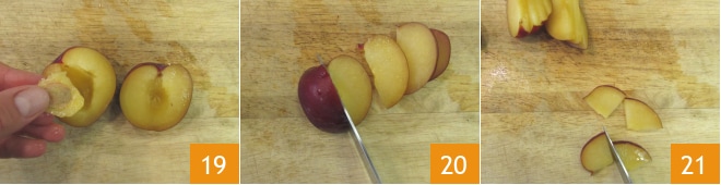 Corte as ameixas ao meio e retire o caroço 19. Corte-as em fatias finas de cerca de 4 mm 20, reserve 150 g de fatias para a decoração e corte ao meio os outros 150 g de fatias 21 que serão usados para o recheio.