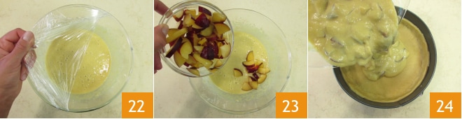 Retire o creme frangipane da geladeira 22, incorpore as ameixas para o recheio e misture 23. Despeje a mistura na casca da massa 24.