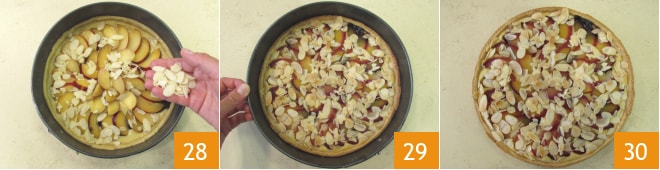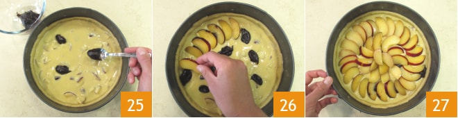 Com uma colher de chá, adicione a geleia de ameixas 25. Coloque na superfície as ameixas reservadas para a decoração 26, criando um padrão em forma de raio 27.
