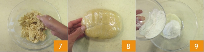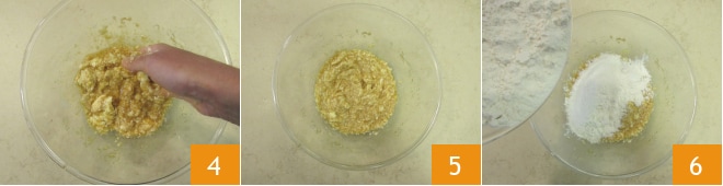 Trabalhe rapidamente com as mãos 4. Obtém-se uma mistura não totalmente homogênea 5. Adicione a farinha 6 e termine de amassar com as mãos.
