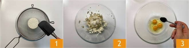 Para preparar o bolo de damasco e ricota, peneire a ricota através de uma peneira 1 para obter um creme sem grumos 2. Em uma tigela, quebre os ovos e adicione o extrato de baunilha 3.