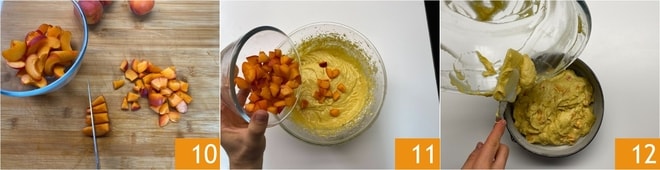 Corte os damascos restantes em cubos 10 e mergulhe-os na massa 11. Transfira a mistura para uma forma de 20 cm untada e enfarinhada 12.