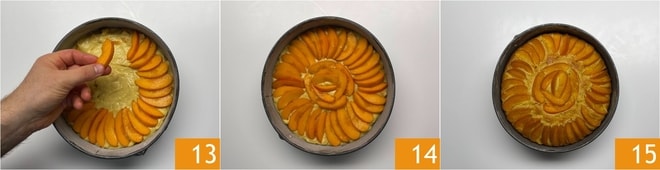 Distribua as fatias de damasco na superfície 13 para criar um padrão raiado 14 e asse em forno estático pré-aquecido a 170°C por cerca de 70 minutos. O bolo de damasco e ricota está pronto 15, deixe esfriar, desenforme e sirva polvilhando com açúcar de confeiteiro.