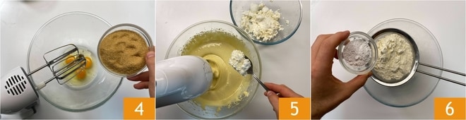 Bata os ovos com a batedeira em velocidade média-alta, adicionando aos poucos o açúcar 4; isso levará cerca de 10 minutos. Uma vez obtida uma mistura clara e espumosa, incorpore a ricota, uma colher de cada vez 5. Peneire a parte a farinha e o fermento 6,