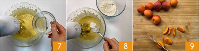 Incorpore o óleo em fio 7, em seguida, adicione as farinhas aos poucos na massa, mantendo a batedeira em velocidade baixa 8. Lave e seque os damascos: 4 deles serão usados para decoração, destes, corte 12 fatias no total 9.