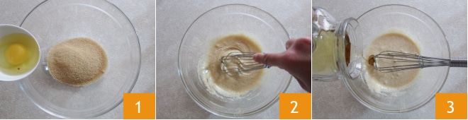 Para preparar o bolo de espelta e morangos, em uma tigela coloque o açúcar e o ovo 1. Misture com um batedor manual até obter uma mistura cremosa 2. Continuando a mexer, adicione o óleo em fio 3.