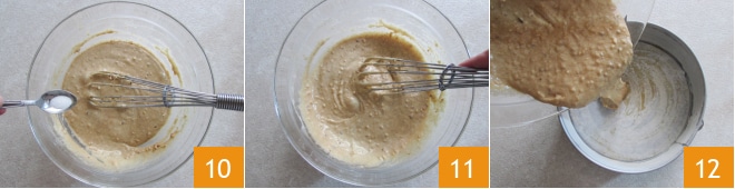uma pitada de sal 10 e misture bem ainda com o batedor 11. Unte e enfarinhe uma forma de aro removível de 22 cm, depois despeje a massa dentro 12.