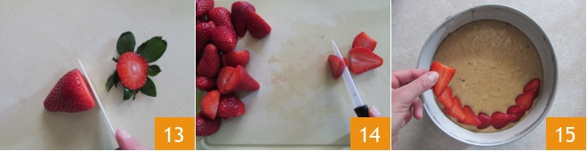 Limpe bem os morangos, remova a parte com as folhinhas e corte em fatias de cerca de meio cm de espessura 14. Decore a superfície do bolo colocando os morangos em forma de raio 15