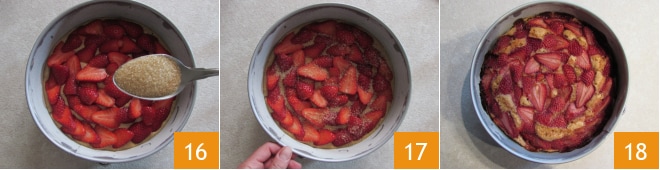 e polvilhe a superfície com açúcar mascavo 16. O bolo está pronto para ser assado 17! Asse em forno estático pré-aquecido a 180° na prateleira central por cerca de 1 hora. Depois retire do forno e deixe esfriar 18.