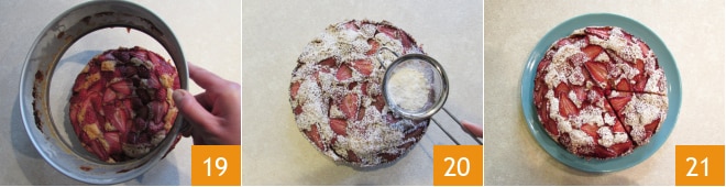 Uma vez frio, desenforme o bolo 19, decore com açúcar de confeiteiro 20 e sirva 21!
