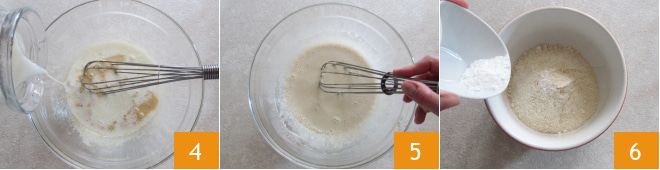 Quando estiver bem incorporado, adicione também o leite de amêndoas 4, sempre continuando a mexer 5. Em outra tigela coloque a farinha de espelta e adicione o fermento 6.