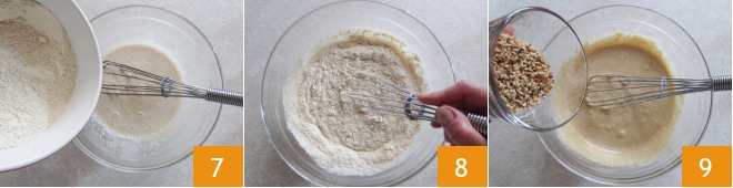 Adicione os ingredientes secos à mistura recém-preparada 7 e mexa novamente com o batedor 8 até obter uma mistura lisa e homogênea. Adicione o granulado de avelãs 9,