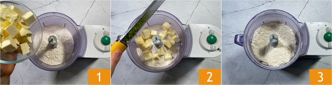 Para preparar a torta tropical, comece pela Massa podre: em um processador com lâminas junte a farinha com a manteiga fria em cubos 1 e a raspa de lime ralada 2, depois triture até obter uma mistura com aspecto arenoso 3.