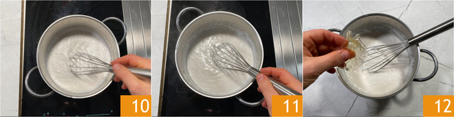 Leve ao fogo e cozinhe por cerca de 10 minutos, mexendo constantemente 10; se começar a ferver, afaste do fogão. Quando o creme estiver mais espesso 11, desligue e acrescente a gelatina 12.