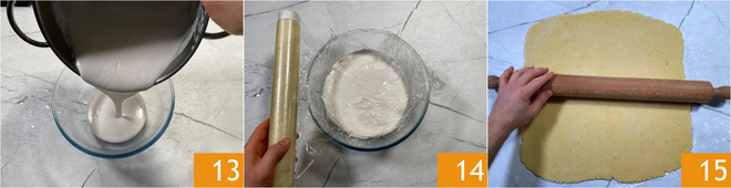 Despeje o creme em uma tigela 13, cubra com filme plástico em contato e deixe esfriar na geladeira por pelo menos uma hora 14. Após o tempo de descanso da massa, abra-a com 0,5 cm de espessura sobre a superfície levemente enfarinhada 15.