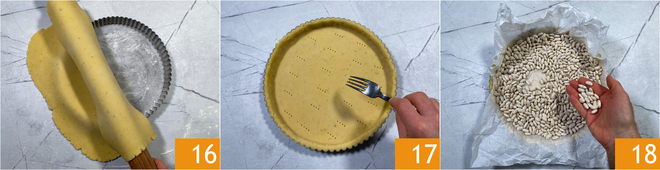 Transfira a massa para uma forma de torta com fundo removível de 27 cm de diâmetro, untada e enfarinhada 16, então fure com um garfo 17. Cubra com um papel manteiga, adicione feijões secos (ou as esferas de cerâmica próprias) e asse à cegas a 170° por 20 minutos 18.