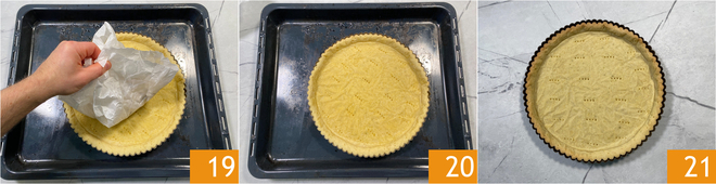 Passado o tempo de cozimento, remova o papel manteiga com os pesos 19 e continue a assar por mais 10 minutos a 180° 20. Retire do forno e deixe a base esfriar 21.