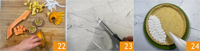 Dedique-se à decoração: lave as frutas e corte: o abacaxi em triângulos, o mamão em cubos, o coco em fatias finas com um descascador e a manga em tirinhas 22. Corte a ponta de um saco de confeitar em diagonal 23 e encha-o com o creme de coco frio. Em seguida, recheie a base da torta com o creme formando um motivo decorativo 24.